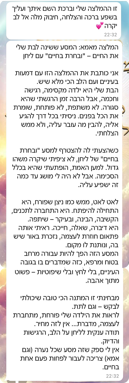 המסע ובחרת בחיים נברא מתוך ארועי החיים האישיים שלי, שבהם חוויתי לא מעט אתגרים וכאבים מסוגים שונים ומותך ניסיון ארוך שנים למול לקוחות ואחרי שניסיתי לא מעט תהליכים ומחקירה והתבוננות לעומק מצאתי את הדרכים והפתרונות הפרקטיים והיעילים ביותר שהביאו אותי לחיים שאני חלמתי עליהם מתוך הלב שלי והרצון לעזור לנשים נוספות לצאת מתחושת התקיעות, הכאב, האובדן ועוד ולמצוא את השלווה הפנימית שמגיעה לך. זה לא קסם, זה תהליך, ולכן חשוב לי שאם תחליטי להגיע ולעבור את המסע יחד איתי שתגיעי עם ראש פתוח ולב מלא רצון, אם לא תהיה נכונות להיפתח לעולם הזה לא יקרה שום שינוי.