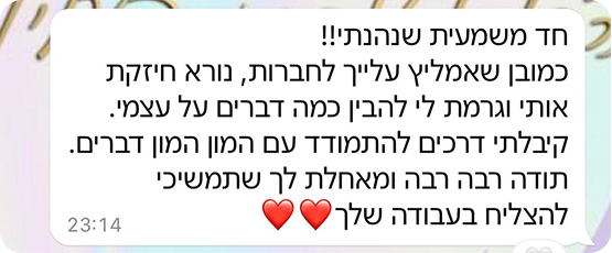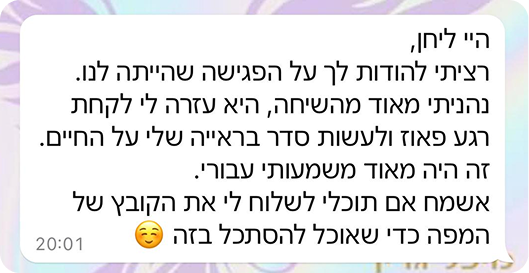 התחלנו תהליך יחד, י׳ הגיעה עם המון חסמים ואמונות מגבילות שעצרו אותה מלהשיג את מה שרצתה בחיים שלה. אחרי המפגש הראשון היא סיפרה לי שיצאה לדייט ושאפילו ממש נהנתה בו.