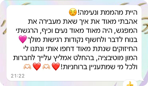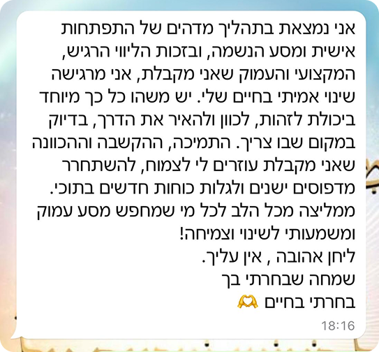 אני רוצה לעזור לכמה שיותר נשים ולאפשר לכל אחת ואחת לעבור את המסע המדהים הזה ולכן המפגשים מתקיימים בזום ככה שלא משנה איפה את נמצאת תוכלי להשתתף ולתת לעצמך את מה שלא הרשת לעצמך עד היום – שקט פנימי ובהירות.
