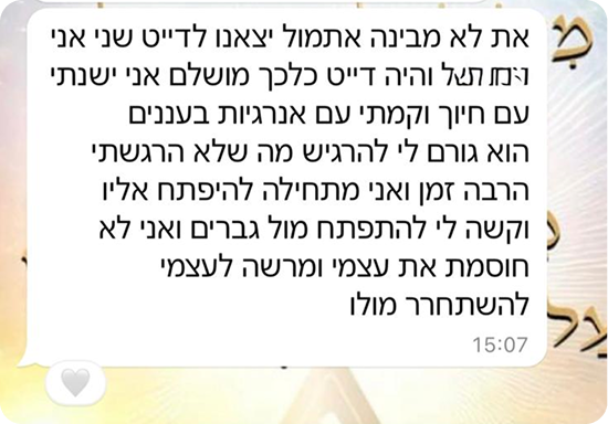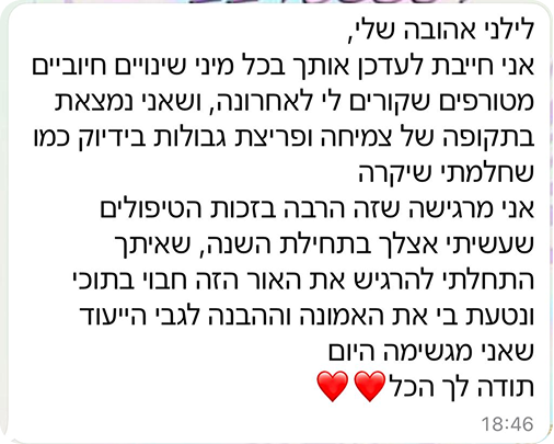 החיבור הזה העניק לה שלווה שלא חוותה שנים רבות, ביטחון פנימי שאינו תלוי באחרים, ואהבה עצמית שהתעוררה מחדש.