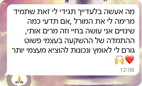 אישה שבוחרת בעצמה ורוצה שינוי אמיתי, תגיע פתוחה ותשקיע בכל תהליך שיביא אותה לטרנספורמציה ושיפור החיים.