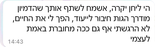 החוויה בזום בדיוק כמו פנים מול פנים ואפילו יותר עוצמתית מניסיון של מחזור קודם, את יכולה לשבת במקום הנוח שלך ובאמת להרגיש חיבור עמוק.